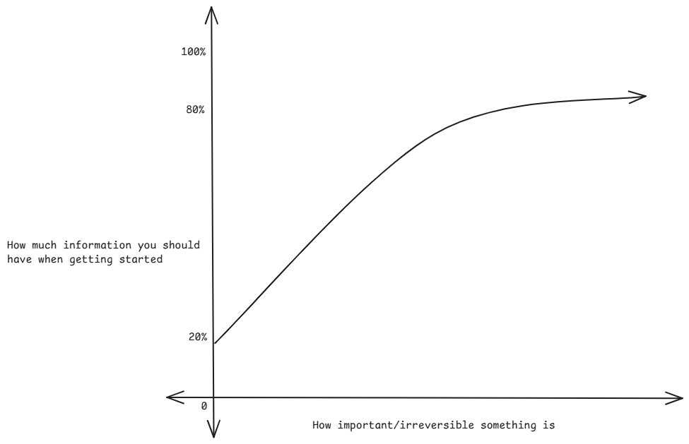 Notice that the curve flattens and never reaches 100% (even the numbers 20% or 80% are abstract numbers for the sake of giving an idea). The simple reason? Execution, i.e., getting started, is a part of the information-gathering process. In fact, it is the most integral one. You can have all the meetings and ready all the plans, but execution is where the final bit of “Oh, we probably didn’t think of this” comes up. And you would be surprised how many jobs are usually planned to perfection but break down in execution.