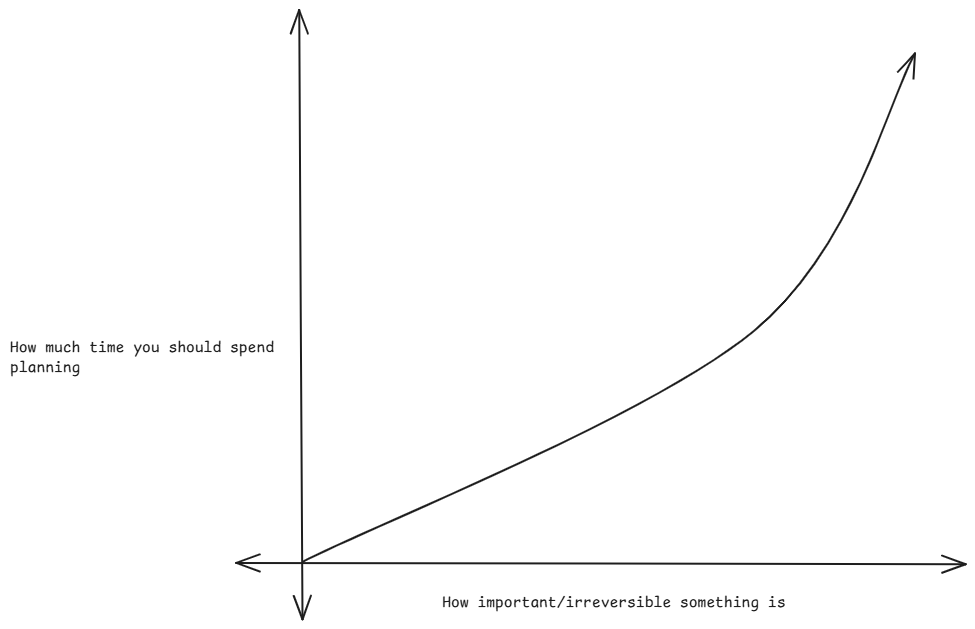 There’s this very interesting curve on how important something is, and how much time you should spend planning. The same curve also works on how “irreversible” doing something is, something Jeff Bezos famously notes as one-way and two-way doors.